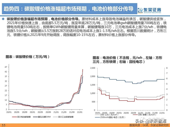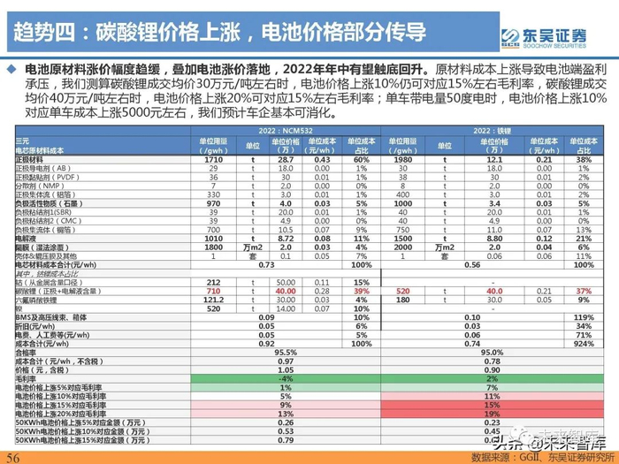 2021全年磷酸铁锂价格累计涨幅160%,原材料磷酸铁、碳酸锂价格上涨顺利传导:2021年磷酸铁锂价格 触底反弹,从年初3.8万元/吨涨至9.9万元/吨,涨幅160%,主要受铁锂行业需求爆发供不应求,且原材料 成本快速上涨影响;原材料磷酸铁价格由2021年2月的1.25万元/吨涨至2021年末的2.3万元/吨,累计上涨 84%,碳酸锂价格从2021年初5万元/吨+上涨4倍至年末的28万元/吨+,考虑1吨铁锂用0.23吨碳酸锂,原 材料成本涨价可顺利传导。