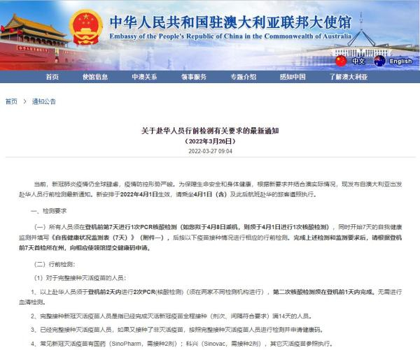 据中国驻澳大利亚大使馆网站消息,当前,新冠肺炎疫情仍全球肆虐,疫情防控形势严峻。为保障生命安全和身体健康,根据新要求并结合澳实际情况,现发布自澳大利亚出发赴华人员行前检测最新通知。新安排于2022年4月1日生效,请乘坐4月1日(含)及此后航班赴华的旅客遵照执行。