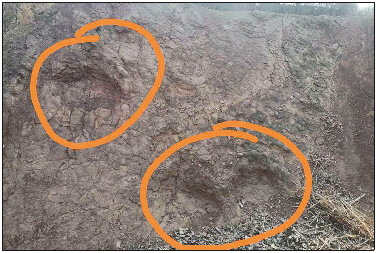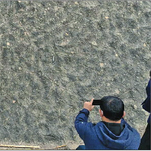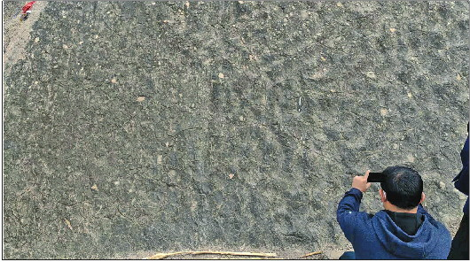 据介绍,此处是诸城市恐龙文化研究中心今年新普查出来的一个新的恐龙足迹化石点,前期在距离这里十公里之外的化石点,也发现了蜥脚类恐龙足迹和兽脚类恐龙足迹,证明中生代时期曾有大量的蜥脚类恐龙和兽脚类恐龙在这里生活过。
