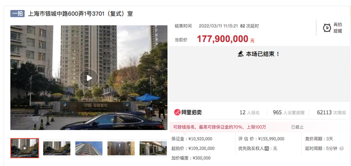 根据法院发布的公告,这套房最初的起拍价是1亿元,评估价是1.56亿元,起拍单价只有18万元/平。最终成交价溢价率高,远远超过了实际评估价。