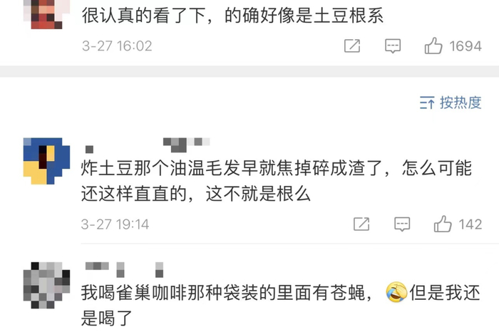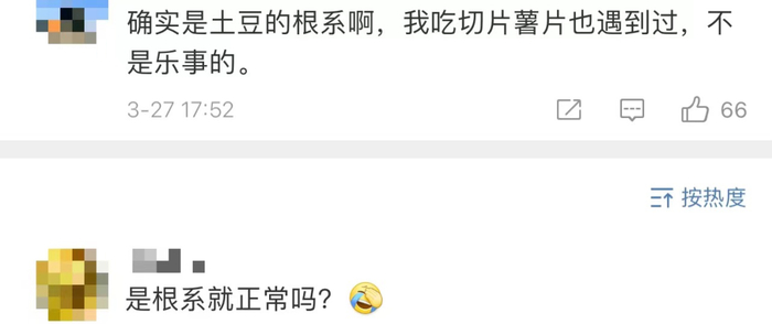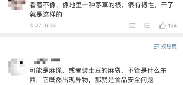话题登上热搜,引发网友热议。有网友表示好像是土豆根系,也有网友认为肯能是麻绳之类的异物,既然出现异物,就存在食品安全问题。