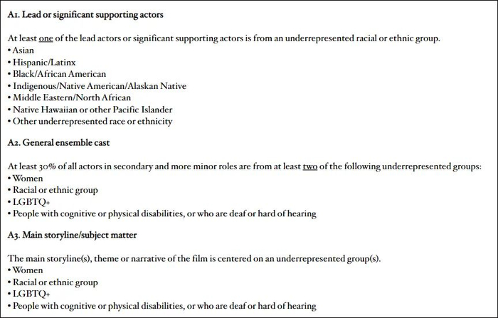 第二点是,从2024年开始,对“最佳影片”的定义有了新标准。新标准从“荧幕呈现、主题与叙事”“创意团队主管+部门主管”“行业机会”“观众开发”4个方面着手,要求电影的人员构成中必须有亚裔/拉美裔/非裔/印第安土著/中东/北非、夏威夷原住民等少数族裔(以下简称“少数族裔”)以及女性/少数族裔/LGBTQ+/精神或身体有疾病的少数群体(以下简称“少数群体”,包含少数族裔),并对这些群体在电影团队中所占比例做出要求。