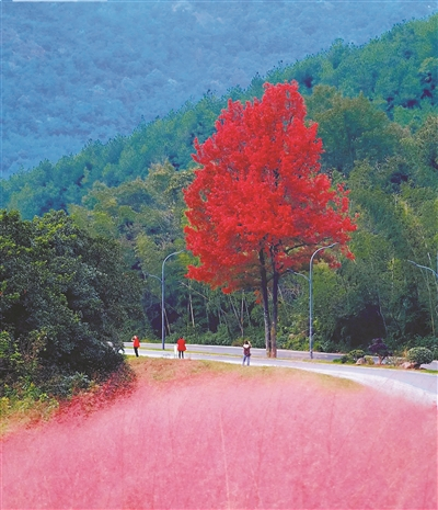 各处杉树风景也会“实力抢镜”。其中,奉化亭下水库有棵红色池杉树,常年在湖旁一片草地上孤独站立,在明媚透亮的阳光下颇为出彩。