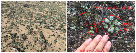 古尔班通古特沙漠东南缘火灾,尖喙牻牛儿苗果实产量随降水量的增加而增加,因此,越是丰水年,越要防范沙漠火灾 (摄影:臧永新)