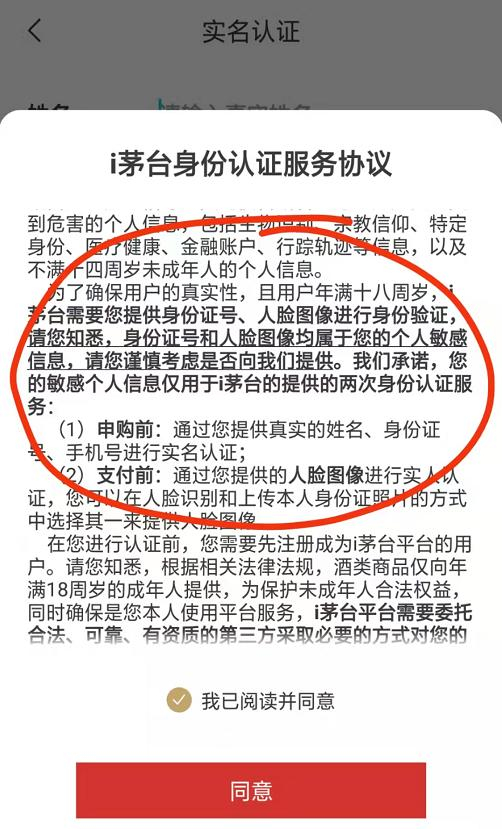 第二、申购前必须进行身份认证。“i茅台”注册页面显示,用户需提供身份证号、人脸图像进行身份验证。消费者支付前需要通过人脸图像进行认证。成功购买后,平台会给消费者发送生成的“提货码”。获得提货码后,消费者可在72小时内前往最近的茅台官方自营店提货。