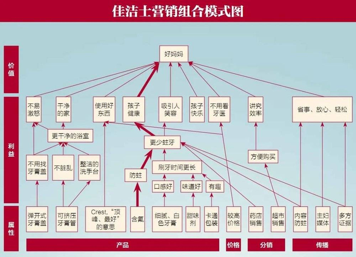 有专家认为,属性通过工具利益影响心理利益,进而影响个人价值。例如,佳洁士儿童牙膏的价值定位点是“让顾客成为一个好妈妈”,心理利益为“让孩子具有吸引力和可爱”,功能利益为“防止蛀牙,孩子健康”,属性定位为含氟,四者之间具有清晰的因果关系。