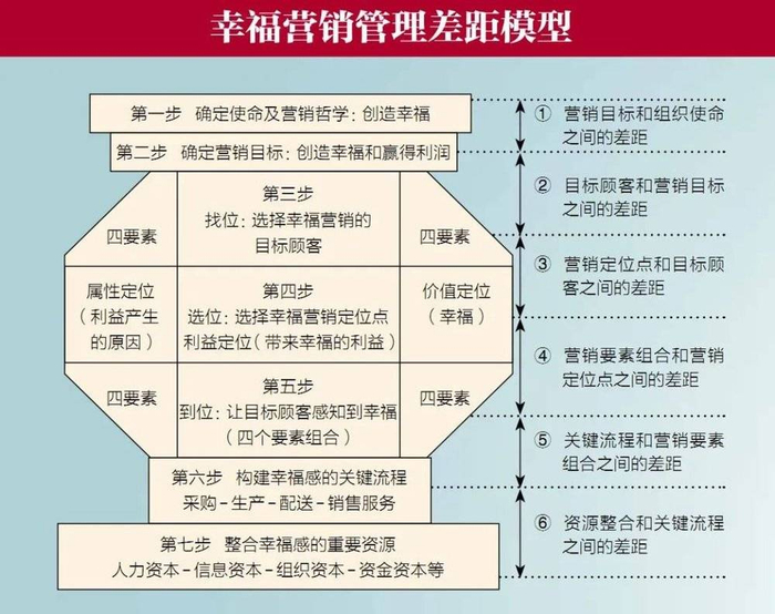 为帮助企业更好地落实幸福营销管理,我们建立了一个幸福营销管理差距模型,它包括需要完成的七大步骤,以及需要弥合的六大差距。