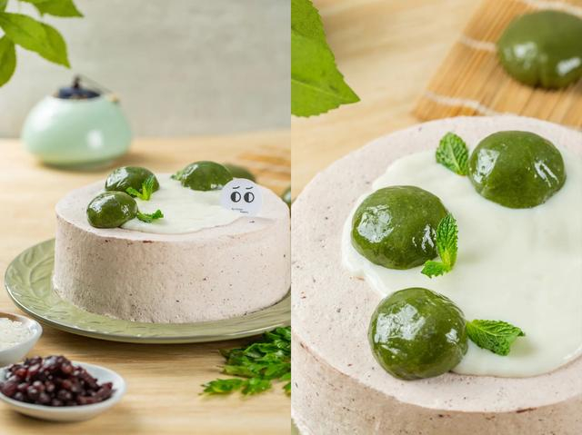 除了装饰用的mini青团,蛋糕的层次分别是艾草糯米蛋糕坯、红豆沙奶油、麻薯夹馅,从外到内都有着青团“糯唧唧”口感的影子,可以说是将传统的青团重新“排列组合”,把青团的“DNA”融入蛋糕。