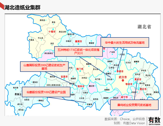 于是,造纸业迁移的第一站自然就是湖北,五洲特纸,玖龙,晨鸣纸业,仙鹤股份,中顺洁柔纷纷开始在湖北布局。