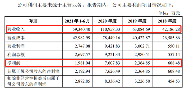 较高的定价为阿宽巨额的营收打下了基础,据招股书披露,2018年-2021年上半年公司营收分别为4.22亿、6.31亿、11.09亿、5.93亿,营收增速可观,然而再看净利润就没这么好看了,2018年-2021年上半年公司实现归母净利润分别为608.48万、2364.85万、7626.49万、2192.94万,对应的净利率分为1.42%、3.75%、6.87%、3.69%!