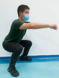 张新涛主任为深蹲爱好者支招深蹲的规范动作:首先两脚左右开立,与髋同宽或者与肩同宽,或者自己觉得舒适的距离,重心保持在两胯中间;下蹲时,膝盖务必保持与第二、三脚趾一个方向,腰背保持收紧、挺直;小腿与整个躯干平行(侧面观,这一点非常重要),下蹲至大腿与地面平行即可,不可蹲太低(下图)。
