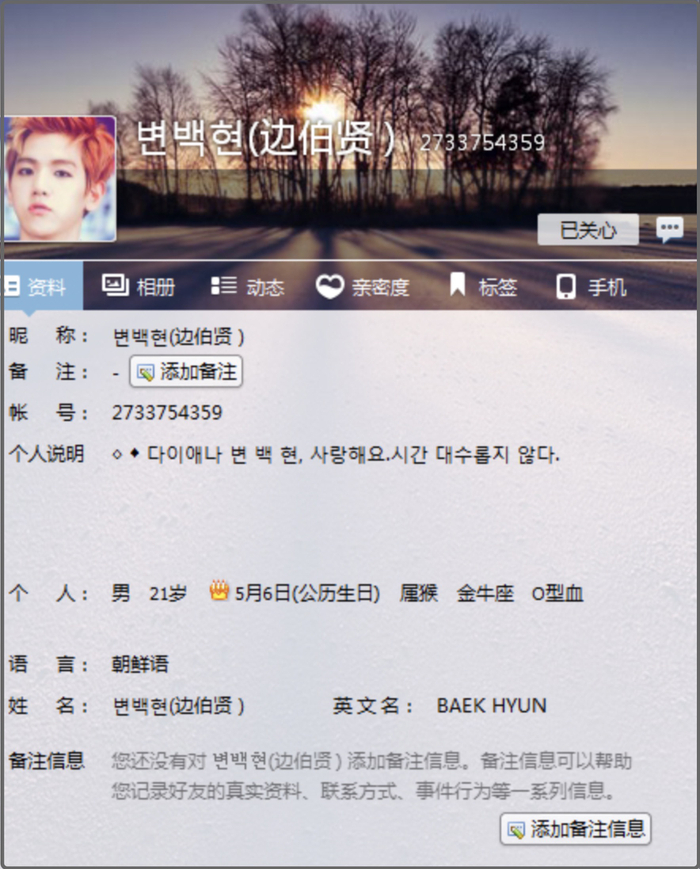 只见她打开尘封已久的QQ,我瞥了一眼上面的昵称叫→☆恶魔de吻痕丶,搜寻一番通讯录后赫然发现边伯贤位列其中,QQ签名写的是“世界上没有不劳而获的事情”,很符合“你知道我们哥哥有多努力么”的人设。