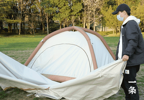 开机后,充气泵会释放气流,通过给帐篷咖色支撑气柱充气的方式,来让帐篷自己站起来。