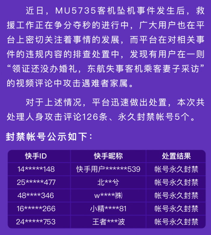 26日下午,快手黑板报微信公号发布消息称:5个账号在视频评论中攻击遇难者家属,被永久封禁。