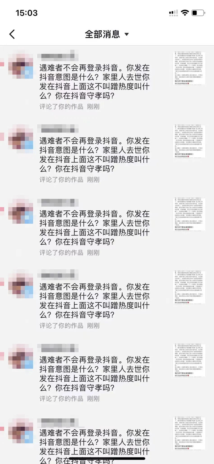 相关截图显示,有网友反复刷屏评论称,“家里人去世你发在抖音上面这不叫蹭热度叫什么?你在抖音守孝吗?”也有网友私信骂道,“蹭热度不让人说啊?”