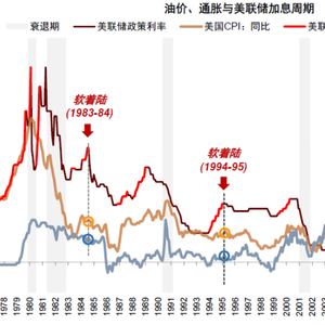 图表:美国经济有7次在加息后陷入衰退,只有2次(1983-84与1994-95年加息周期)实现“软着陆”。这两次货币收紧“软着陆”的共同点是油价没有大幅上升