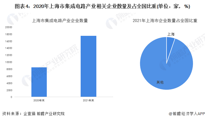 随着上海市集成电路产业的迅速发展,集成电路企业数量也快速增长。企查猫数据显示,截至2021年底,上海共有集成电路相关企业17457家,同比增长104.80%,企业数量占全国集成电路相关企业数量的5.21%。