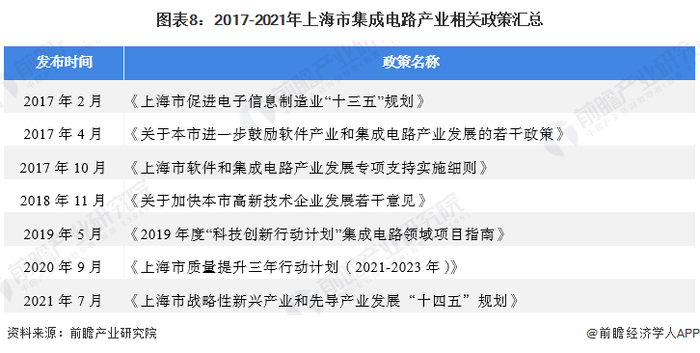 集成电路产业是上海市政府大力发展的战略性新兴产业之一,也是上海市的三大重点产业之一。截至2021年末,上海市相关部门多次出台支持政策促进集成电路产业发展。2021年7月,《上海市战略性新兴产业和先导产业发展“十四五”规划》发布,为上海市集成电路产业在“十四五”时期的发展指明了方向。