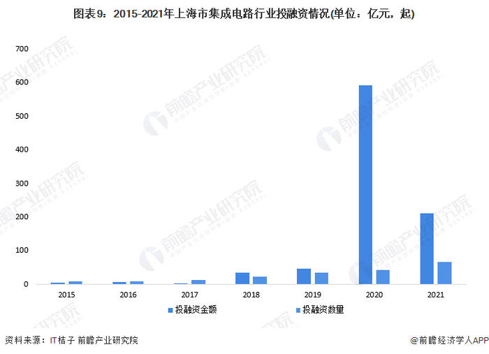 根据IT桔子的统计,2015-2021年间,上海的集成电路投融资事件数量与投融资金额呈现明显的波动增长态势。2021年,上海市集成电路产业实现投融资事件65起,投融资金额209.60亿元。
