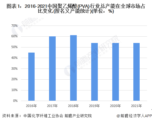 进入21世纪,得益于国内齐全的产业链布局、充分的政策支持、相对廉价优质的劳动力等因素,全球PVA产能逐渐向中国市场集中,国内PVA产业得以快速发展。另外,随着传统PVA产品市场的竞争日益加剧,国际PVA巨头逐渐向下游高附加值的领域延伸,部分企业逐步退出传统PVA市场,而中国企业在全球PVA市场发挥着越来越重要的作用。2021年,国内的聚乙烯醇(PVA)产能(名义产能)占全球总产能的比重超过50%。