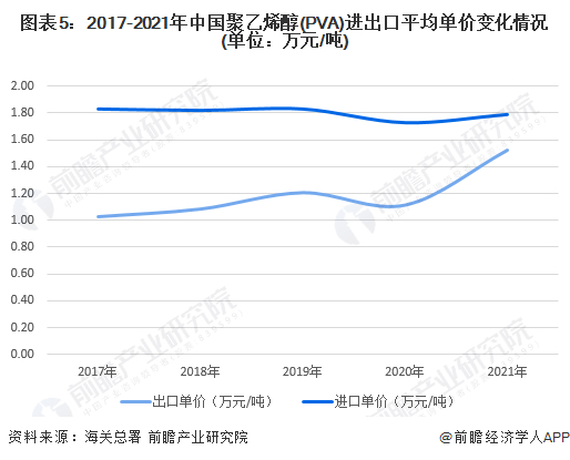 另外值得注意的是,2017-2021年我国聚乙烯醇(PVA)行业平均出口单价呈现波动增长的态势,2021年行业平均进口单价增长至1.52万元/吨,也反映出国内聚乙烯醇(PVA)出口产品品质有所提升,国内产业结构调整有所成效,在国际市场的竞争正逐渐从低价策略竞争向高端市场竞争转型。