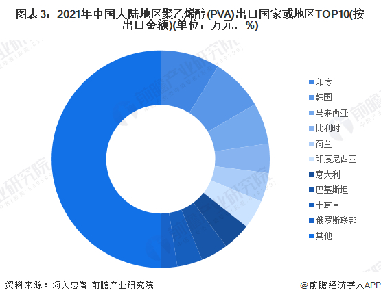 从出口地区来看,2021年,中国大陆地区的聚乙烯醇(PVA)产品的出口国家或地区超过100个,其中对外出口金额最大的地区是印度,占比超过10%;其次是对韩国、马来西亚、比利时、荷兰等。在出口金额排名前十的国家或地区中主要是亚洲和欧洲国家,整体来看我国聚乙烯醇(PVA)行业企业向亚洲、欧洲地区的出口布局较多。