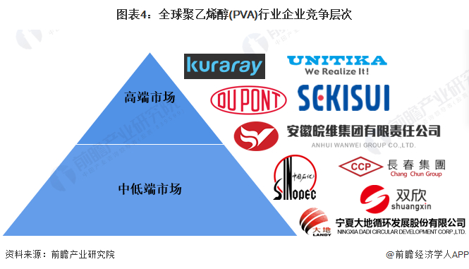 从全球聚乙烯醇(PVA)市场的竞争层次来看,目前国内大部分企业的聚乙烯醇(PVA)产品是中等聚合度、高醇解度的普通PVA产品,以中低端市场竞争为主,而高聚合度、低醇解度的高端PVA市场主要由日本可乐丽公司、日本积水化学、日本尤尼吉可以及美国杜邦公司等大型跨国企业占据,国内外产品技术水平尚有一定差距。