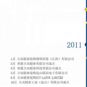 2012年4月9日晚,立讯精密发布公告称,拟以9800万元收购福建源光电装有限公司(下称“源光电装”)55%股权。据悉,源光电装的经营范围包括汽车电子装置制造(汽车发动机控制系统、车身电子控制系统等系列)及汽车组合线束、塑胶配件等零部件制造。