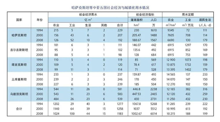 在哈萨克斯坦,河流年均供水量仅为2万米3,在独联体国家中列倒数第二。盛产石油的土库曼斯坦素有“水比油贵”的说法,由于缺水,许多居民甚至要定时领取饮用水。乌兹别克斯坦的年人均水资源量(自产)仅为702米3,按联合国的标准(1000米3/人),属于严重缺水国家。