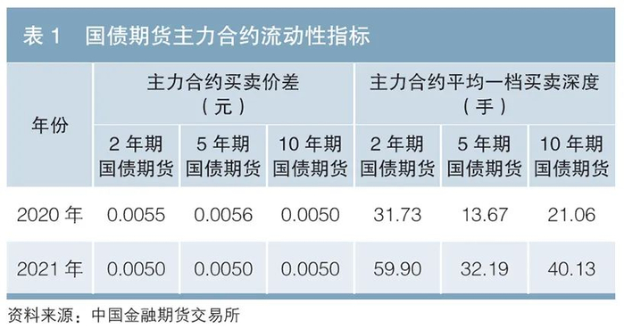 自国债期货上市以来,国债期货市场流动性持续改善,特别是2019年引入做市商制度以来,国债期货呈现买卖价差收窄、报单深度增加等特点,投资者的交易成本持续下降。从买卖价差看,国债期货平均买卖价差明显缩小。2021年,2年期、5年期、10年期主力合约日均最优买卖价差均保持在1 个最小变动价位左右,2年期、5年期、10年期的远月合约、交割月合约日均最优买卖价差也大幅收窄。从报单深度看,国债期货平均报单深度增加。2021年,2年期、5年期、10年期主力合约平均一档买卖深度分别为59.90手、32.19手、40.13手(见表1),较2020年分别提高88.78%、135.48%、90.55%。