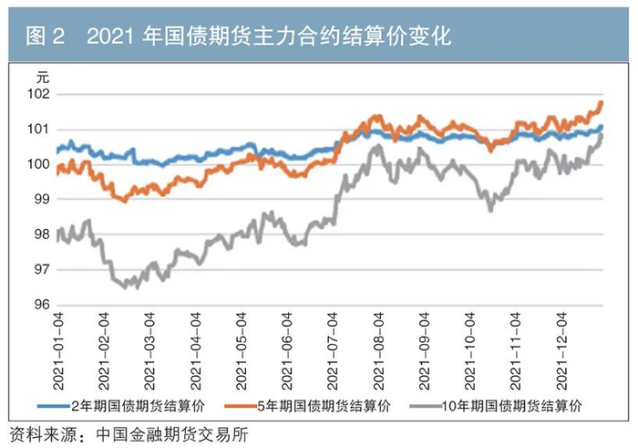 国债期货价格跟随现券价格走势震荡上行。2021年末,2年期、5年期、10年期国债期货主力合约结算价分别为101.080元、101.715元、100.760元,较2020年末分别上涨0.690元、1.905元、2.795元,涨幅分别为0.69%、1.91%、2.85%(见图2)。
