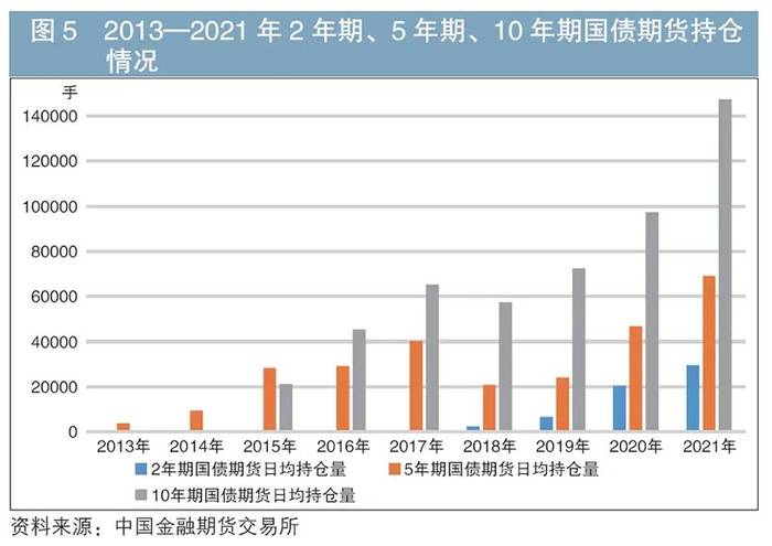 一是进一步丰富产品体系,上市30年期国债期货和国债期权等产品。海外成熟市场的经验表明,完善的国债期货产品体系应当涵盖2年期、5年期、10年期、超长期(30年期)四个主力品种,并有与之相配套的国债期权产品。当前,我国市场还缺少有效对冲超长端利率风险的工具,场内利率期权产品也是空白。2021年,超长期限国债的主要投资者保险机构已经进入国债期货市场,上市30年期国债期货能够更好满足保险机构的风险管理需求,同时,在国债期货市场稳步发展的基础上推出国债期权,将进一步丰富场内避险工具,形成更加完备的国债期货产品体系。
