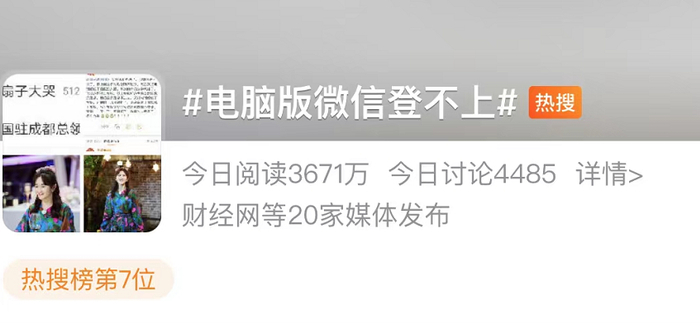 微信电脑版崩了?3月29日早间,许多准备上班的网友发现,微信电脑版出现了无法登录的情况。这一情况迅速引发广泛关注,并一度登上了微博热搜。截至记者发稿,该话题仍在微博热搜第7位,阅读数超过3700万。