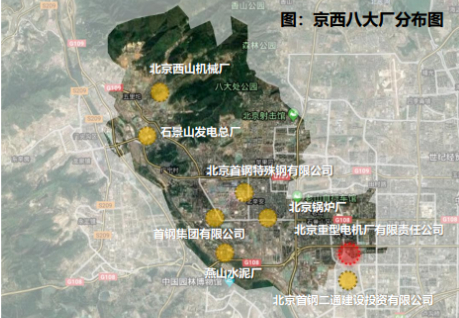 京西八大厂,即首钢集团有限公司、石景山发电总厂、北京首钢特殊钢有限公司、北京重型电机厂有限责任公司、北京首钢二通建设投资有限公司、北京锅炉厂(北锅-巴威)、燕山水泥厂、北京西山机械厂八家工业企业,总占地面积1032.5公顷,总建筑面积851.96万平方米。
