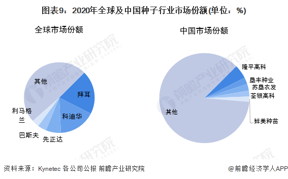 在市占率方面,根据Kynetec统计的市场规模以及各公司公报数据,2020年,全球种子行业市场中,排名前几位的公司依次为拜耳、科迪华、先正达集团、巴斯夫、Vilmorin,市场份额依次为20%、16.8%、6.9%、4%以及3.4%。