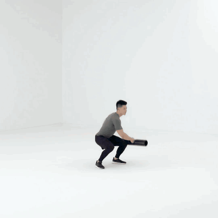 动作要领:根据自己的身体状况选择重量合适的能量筒(或用想要重物代替),开始时,双脚与肩同宽,深蹲时将能量筒下拉至身体左侧。向上跳起的同时,将能量筒举过头顶。下落后,回到深蹲状态,将能量筒下拉至身体右侧。
