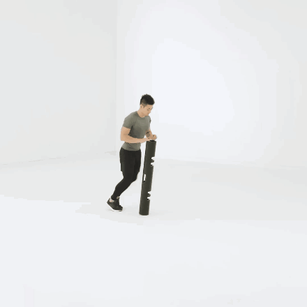 动作要领:选择适合的能量筒,开始时用右手扶着能量筒,将其垂直放于地面。然后向前迈出两步后随即做一个弓步,同时将能量筒倾斜放下,与地面保持15度左右夹角。再恢复到初始动作,用左手扶能量筒,进行弓步。