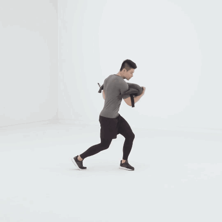 动作要领:选择适合自己重量的牛角包(若没有牛角包则选择相应的重物),双脚分开稍微宽于双肩,然后左脚用力向右侧蹬,上身抱着牛角包向右转动,然后右脚用力向左蹬,身体再向左侧转动。