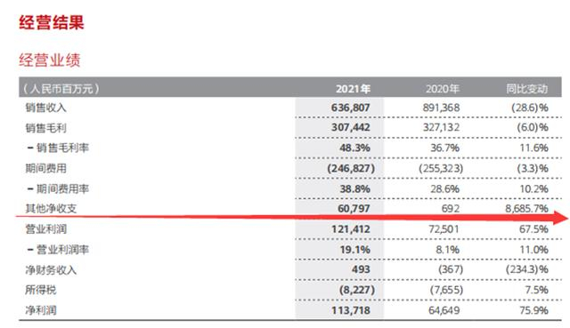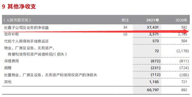 如果剔除掉这574亿元,华为在2021年实现的净利润为563亿元,相较2020年度646亿元净利润同比下滑约13%,2020年华为处置子公司的业务的净收益为5.92亿,对当年净利润影响有限。
