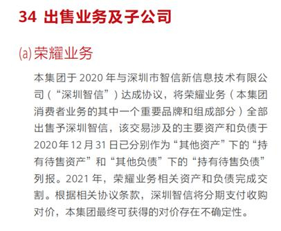 华为表示,华为于2020年与深圳市智信新信息技术有限公司达成协议,将荣耀业务全部出售给深圳智信,2020年,该交易涉及的资产和负债已被作为其他待售资产和持有待售负债列报,2021年,荣耀业务相关资产和负债完成交割,根据相关协议条款,深圳智信将分期支付收购对价。另外,2021年,华为将全资子公司超聚变数字技术有限公司全部权益出售给了第三方,相关资产和负债在同一年完成交割,根据双方协议,购买方将分期支付交易对价。