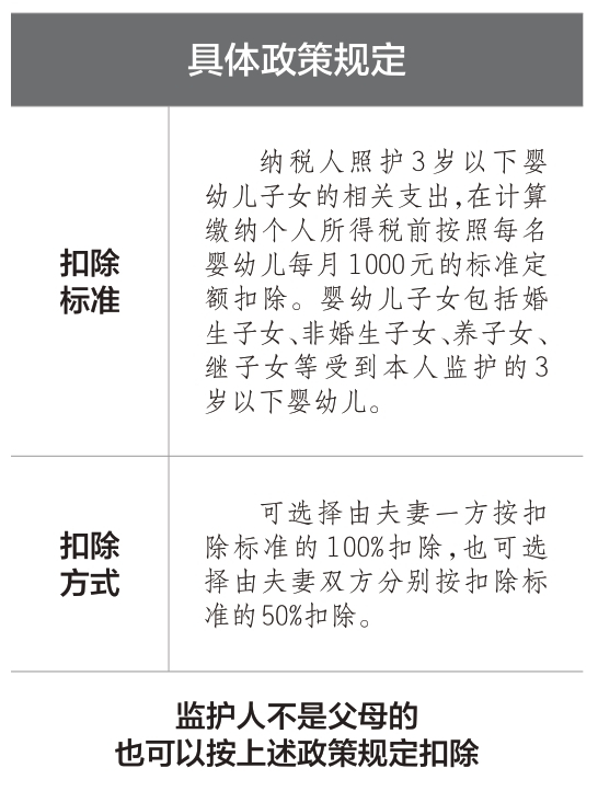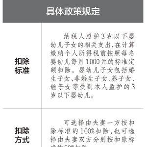 政策实施后,有3岁以下婴幼儿的家庭都将从中受益。按照个人所得税法相关规定,专项附加扣除可以在申报当月扣除,也可以在以后月份发工资时补充扣除;平时发工资没有扣除的,或者没有任职受雇单位的,也可以在次年办理汇算清缴时补充扣除。