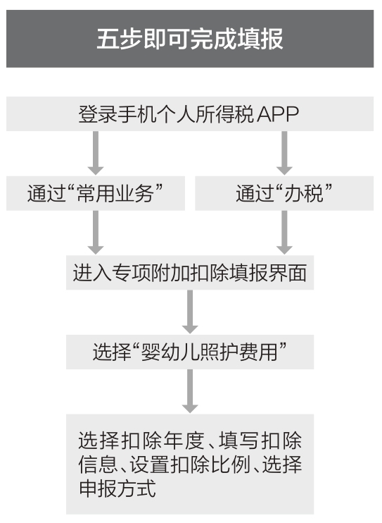 具体来看,政策规定,纳税人照护3岁以下婴幼儿子女的相关支出,在计算缴纳个人所得税前按照每名婴幼儿每月1000元的标准定额扣除。记者登录手机个人所得税APP后看到,一共五步即可完成填报。