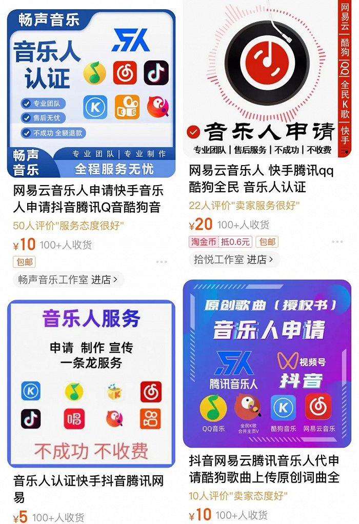 在拼多多、淘宝等平台,只需支付9.9到19.9不等的价格,就会有商家提供音乐人认证的服务。并且,还有商家出售低质量、残次的音乐作品的分轨文件用于参与各类扶持计划,从平台开出的扶持奖励中分得一杯羹。