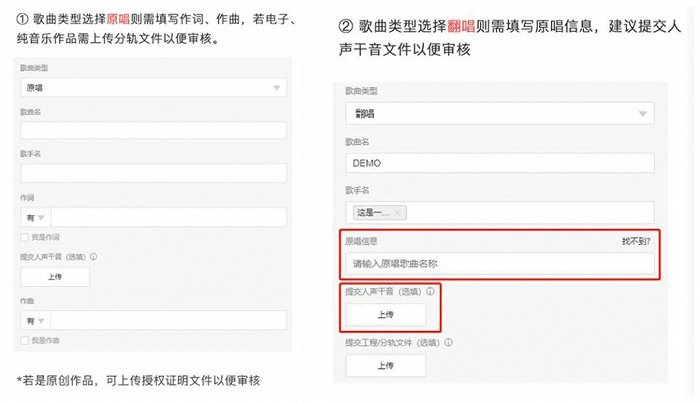 就平台方而言,在独立音乐人的争夺之战中,音乐人注册变得更为友好开放。用户可以选择成为翻唱音乐人和原创音乐人。就翻唱音乐人而言,只需上传人声干声文件,而原创音乐人则可以有选择地上传授权文件,纯音乐、电子、remix作品只需上传音乐作品的分轨文件。