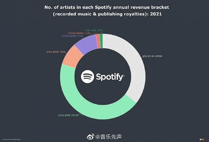 当视野集中于头部艺人的时候,版权分配机制确实为音乐人带来了不菲的创收。但是,在2021年Spotify坐拥的音乐人数量高达800万人,相较之下,收入在1万美元以上的音乐人占比不过是0.66%。