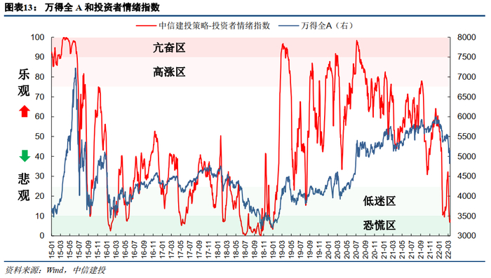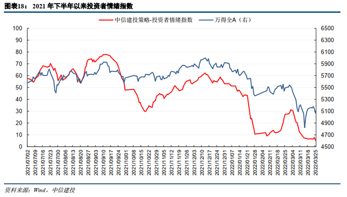 l2022年1月情绪指数大幅下降到10左右,年后降至10以下,2月份有所回暖,但随着俄乌冲突爆发和疫情形势严峻,情绪指数再次快速下降,至3月25日已降至5.4,为2019年以来的最低点。由于情绪指数仍处于低谷,尚未突破10,我们认为抄底时机仍未到来。