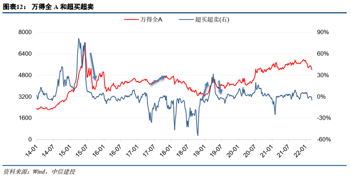 超买超卖指标的基础是RSI指数,即市场涨幅之和占市场涨跌幅之和的比例,衡量了市场多空力量的强弱。该指标反映了市场总体的投资者情绪,在情绪达到高峰和低谷后市场走势将逆转。