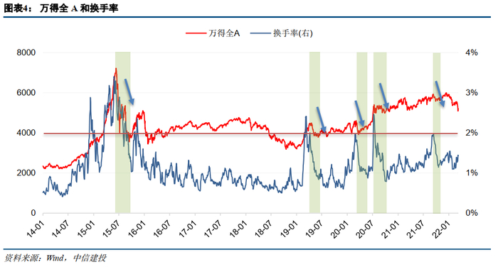 我们使用了万得全A指数的换手率,即成交量除以总流通股数,它体现了A股市场总体的流动性,并与市场情绪有关。长期的低换手率往往成为市场的底部区域,而过高的换手率往往预示着危机,它部分反映了投机和炒作氛围严重,意味着市场在投资者情绪高涨的背景下出现了明显的泡沫。图中换手率的高点(2%左右)后股市都有回调,2015年5月份超3%换手率,2个月内即发生股灾;2019年3月初换手率达2.3%,4月底到5月指数由4500点回调至3900点左右。