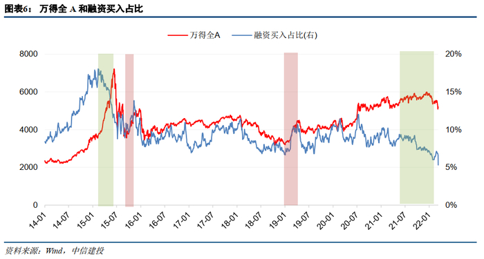 融资买入占比略领先于万得全A指数。2015年4月融资占比开始快速下滑,股市随后在6月大跌;11月则先股市一步回升。2021年底融资买入占比下滑,领先于2022年初市场大跌。