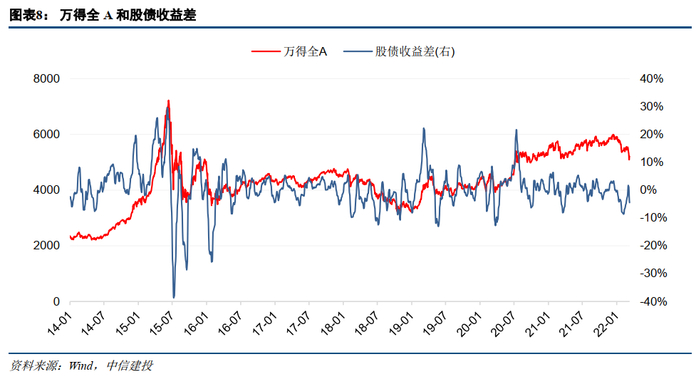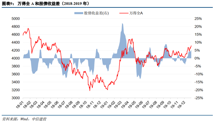 股债收益差提前于市场走势。以2018年-2019年上半年行情为例,2018年股债收益差长期低于0,表明市场情绪不看好股市前景,万得全A指数持续走低;到2019年1月初,股债收益差持续上扬,并在1月20号左右转为正值,滞后约20日股指也快速上涨;股债收益差在2019年3月初达到高点,3月底降回10%以下,4月初降到低点5%不到;万得全A指数也相应滞后约20日,在4月初升至超过4400点,4月下旬开始下降,5月初降到仅3900点左右。